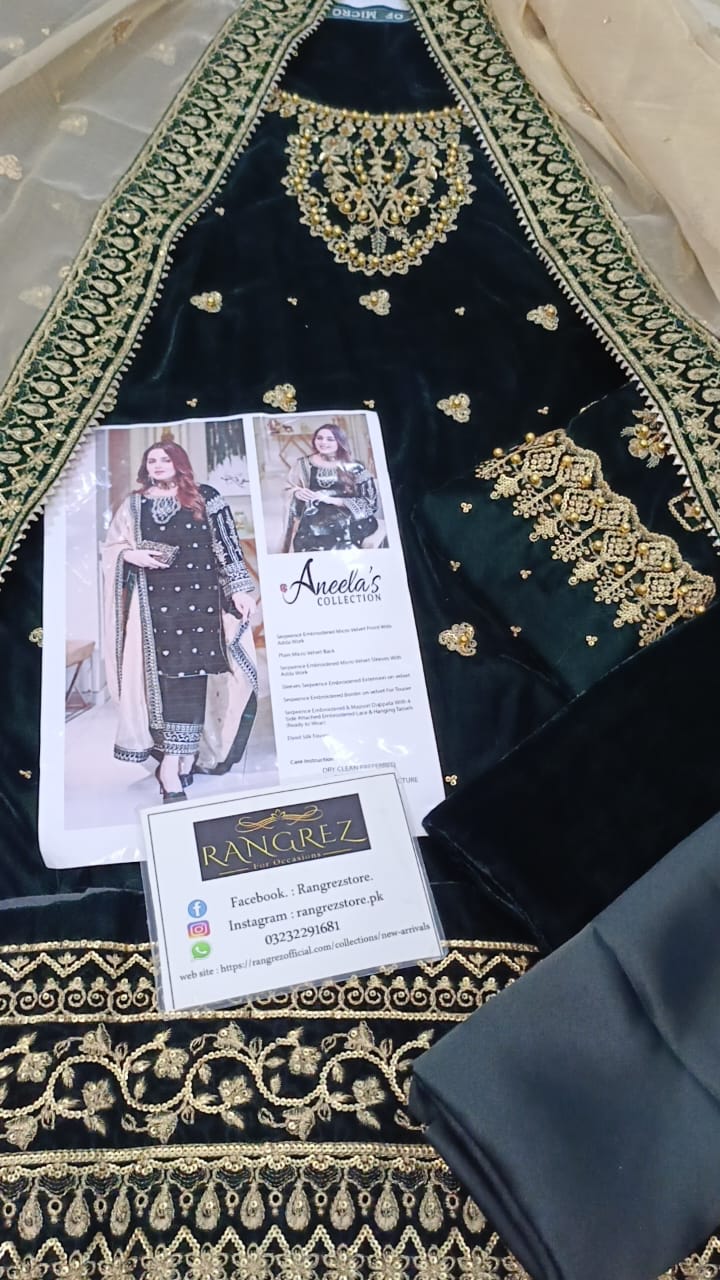 Aneela's Luxury Green Velvet Embroidered Collection 3 Piece Unstitched / Stitched