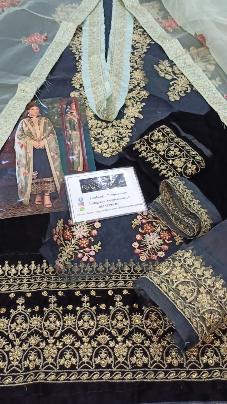 velvet plain front with fully heavy embroidered spengle work daman boarder with embroidered spengle work neckline with embroidered spengle work neck lace with embroidered spengle work chak lace with embroidered daman bunches